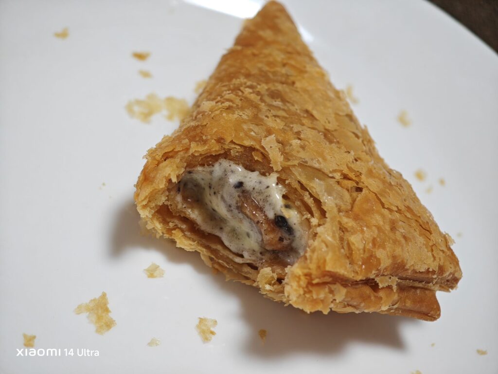 コーヒーの風味感じるティラミスクリームの中にチョコチップが入っており、チョコとティラミスの味わいが三角チョコパイのサクサク生地によく合う。