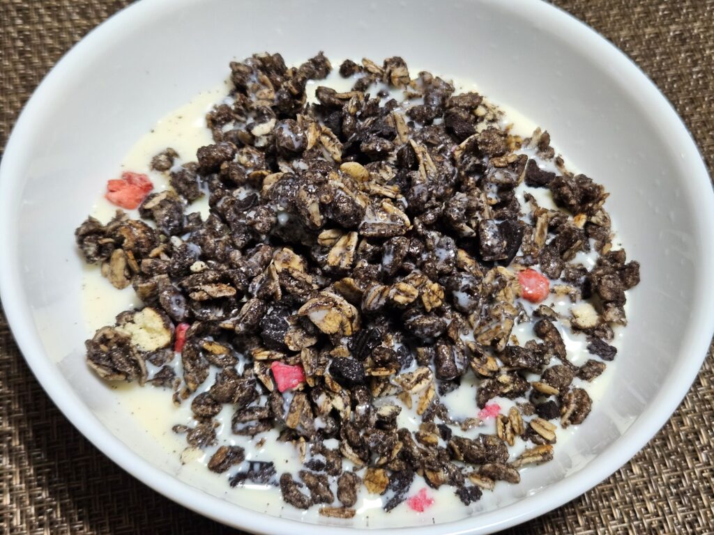 ブラックサンダーといえばザクザクだが、フルグラなのでそもそものザクザク食感は申し分なくチョコ味の効いたグラノーラにドライストロベリーの酸味を味わえる一品だった
